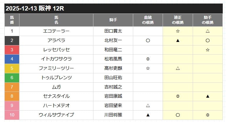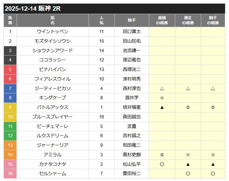 • 評価の高い順(◎〇▲△☆)に印の重なりが多い馬を選出